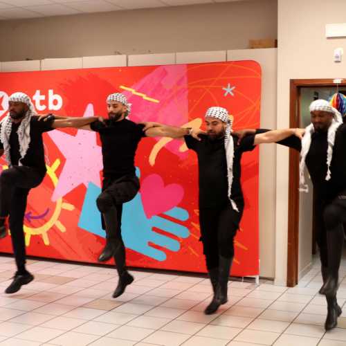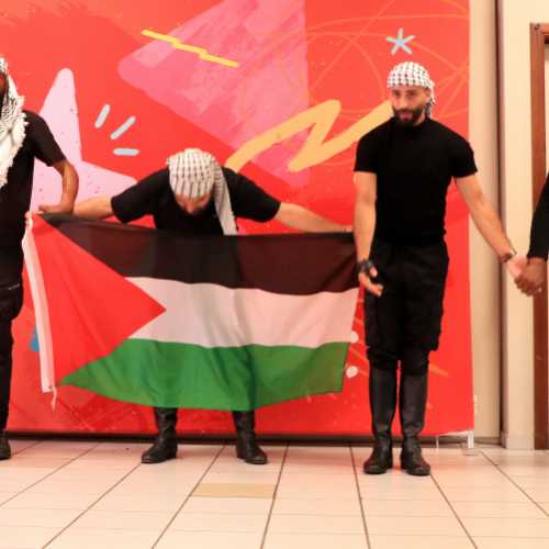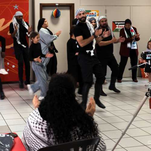 Après l'intervention de Marie-Anne Delahaut, encouragée et entourée par le Collectif Gaza-Palestine, nous avons eu la chance d'accueillir des danseurs du Rajeen Dabkhe Group pour une performance passionnante de Dakbhe qui a ensuite entraîné le public dans sa danse.