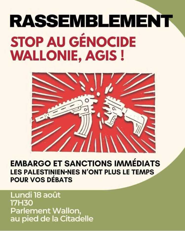 L'assemblée citoyenne réunie face au Parlement de Wallonie ce lundi 18 août 2025 se mobilise avec force pour que le Parlement de Wallonie décide de stopper immédiatement tout commerce d'armes avec Israël, s'il se poursuit, et, dans tous les cas, de ne pas reprendre ce commerce actuellement destiné à massacrer des populations civiles.