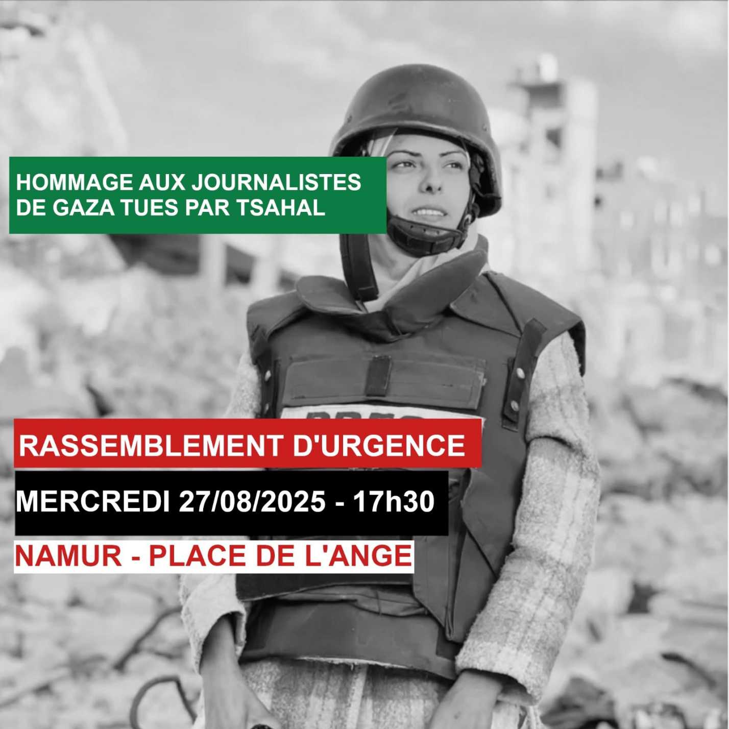 Ce mercredi 27 août 2025, en fin d’après midi, plus de deux cents personnes se sont réunies sur la Place de l’Ange à Namur pour rendre hommage aux journalistes palestiniens tués depuis octobre 2023 dans la bande de Gaza. Ce rassemblement citoyen à l’appel du collectif Action Palestine Namur, intervient dans un climat politique tendu, au lendemain de l’échec du Kern, qui n’a pas permis de dégager une position claire de la Belgique sur la situation au Proche-Orient.