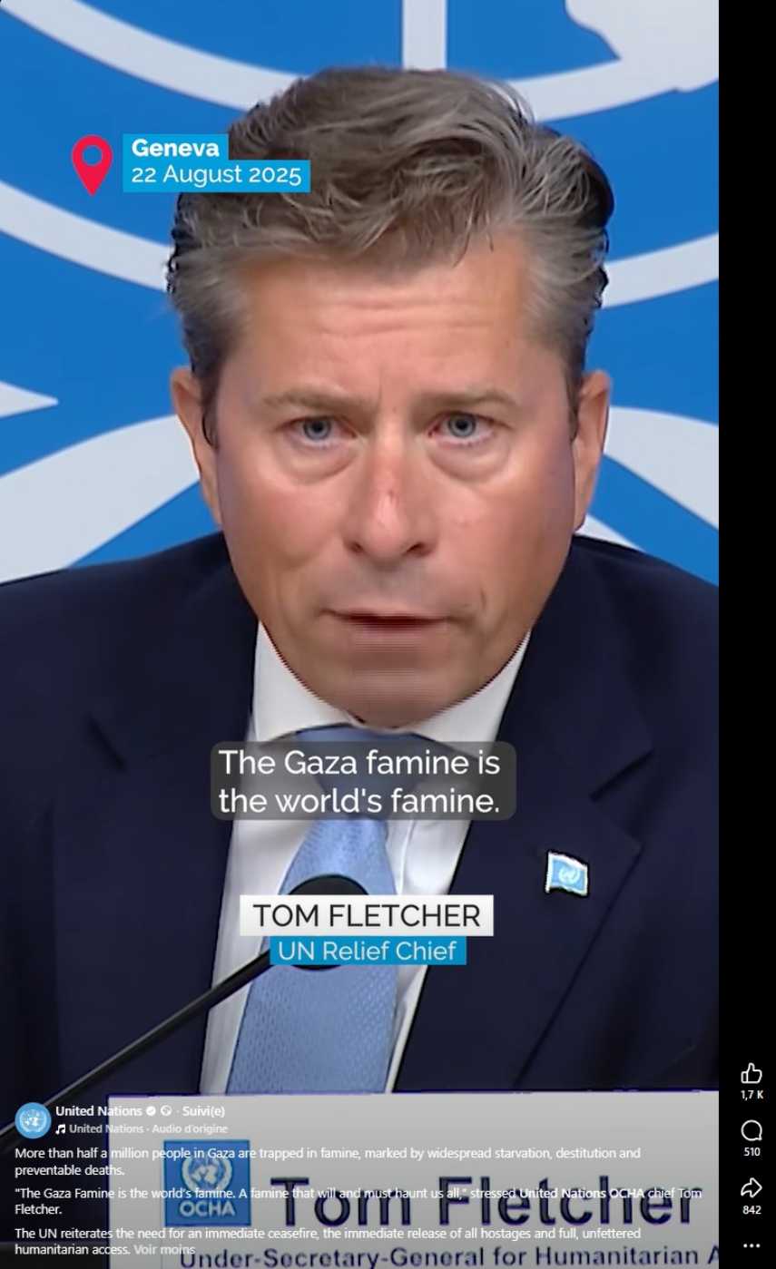 "It is a famine on all of our watch. Everyone owns this. The Gaza famine is the world's famine. It is a famine that asks, "but what did you do?". A famine that will and must haunt us all. Please read the IPC report. Cover to cover. Read it in sorrow and in anger. Not as words and numbers, but as names and lives. Be in no doubt that this is irrefutable testimony. It is a famine. The Gaza famine. It is a famine that we could have prevented, if we had been allowed. Yet food stacks up at borders because of systematic obstruction by Israel. It is a famine within a few hundred meters of food in a fertile land. It is a famine in 2025, a 21st century famine watched over by drones and the most advanced military technology in history. It is a famine that must spur the world to more urgent action, that must shame the world to do better. It is a famine that therefor also asks "... and what now will you do?"