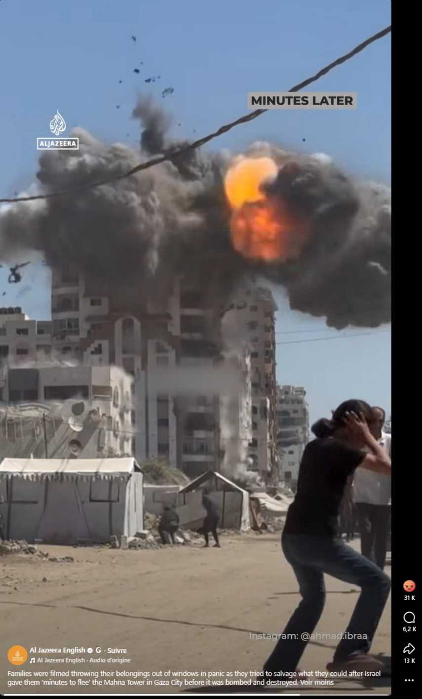 "Families were filmed throwing their belongings out of windows in panic as they tried to salvage what they could after Israel gave them ‘minutes to flee’ the Mahna Tower in Gaza City before it was bombed and destroyed.